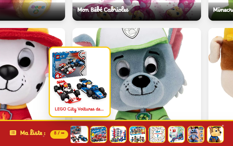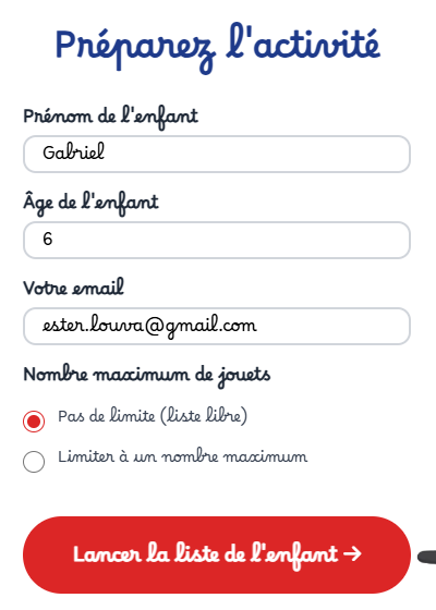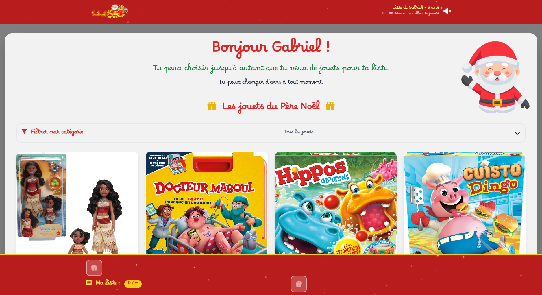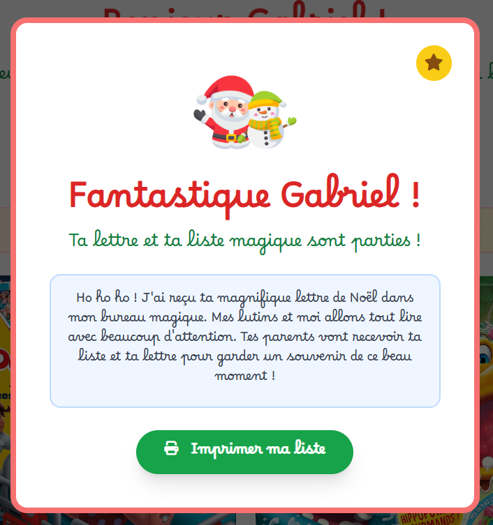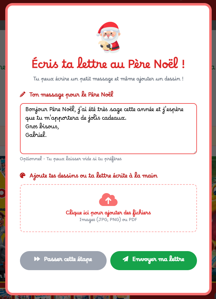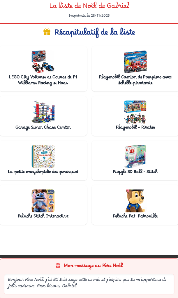 Votre enfant choisit ses jouets préférés dans un décor de Noël, écrit un petit mot pour le Père Noël et peut même joindre un dessin ou une lettre écrite à la main. Une fois validé, vous recevez un premier email souvenir avec la liste des jouets, les dessins et un joli PDF de sa lettre, prêt à être imprimé ou envoyé par courrier. Un second email vous envoie la liste complète des cadeaux souhaités avec, pour chacun, un lien Amazon pour les retrouver et les commander facilement si vous le souhaitez.
